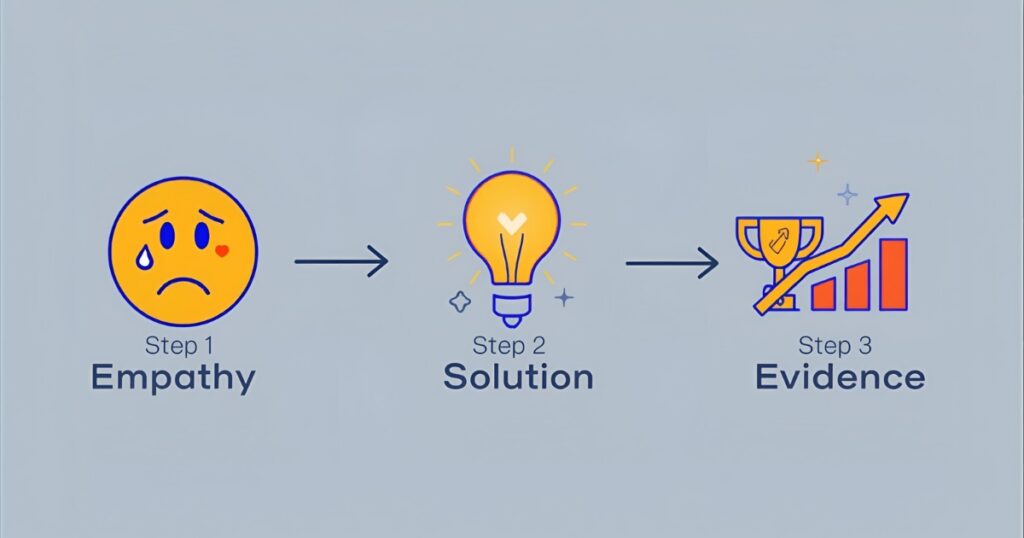 • 共感: 「〇〇でお困りではありませんか?」と顧客の課題に寄り添う。